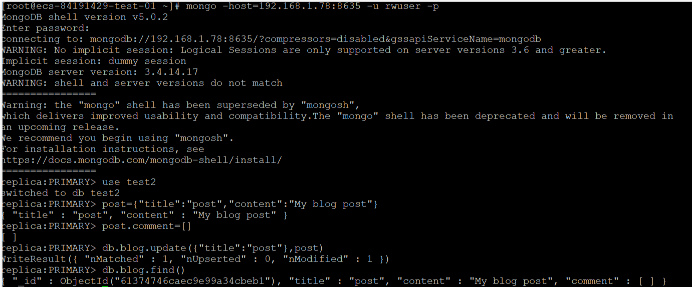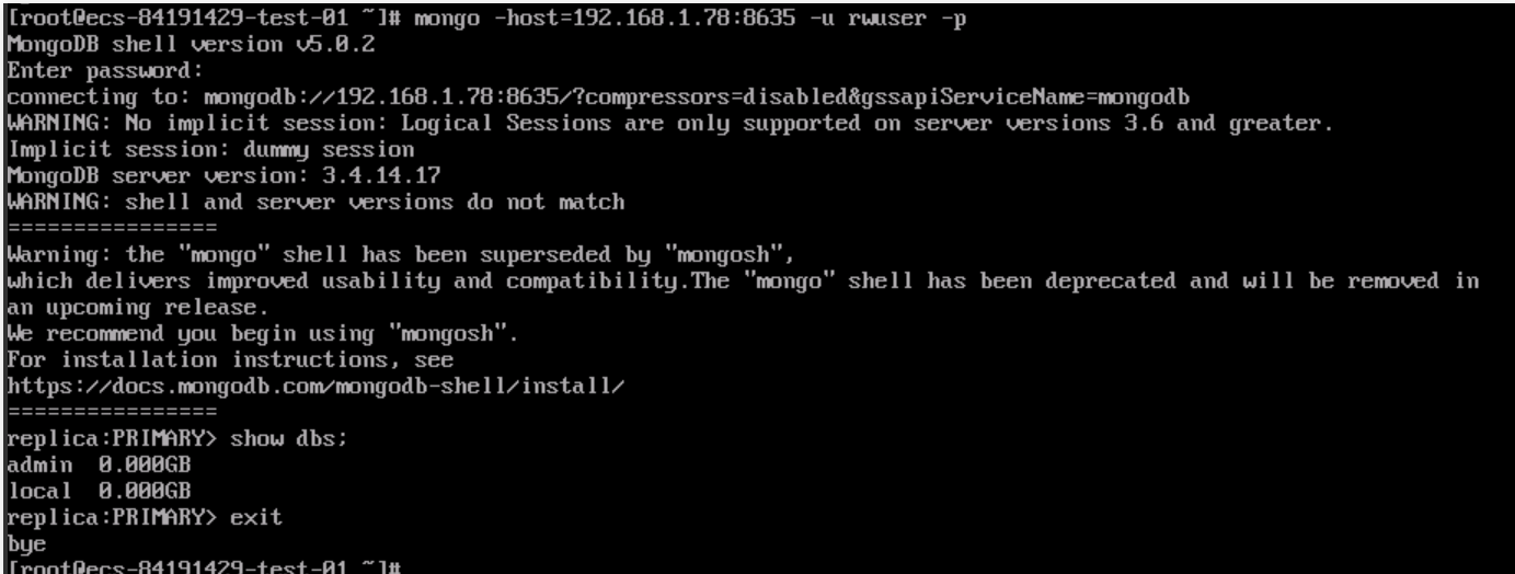 # mongo –host 192.168.1.78:8635 –u rwuser -p