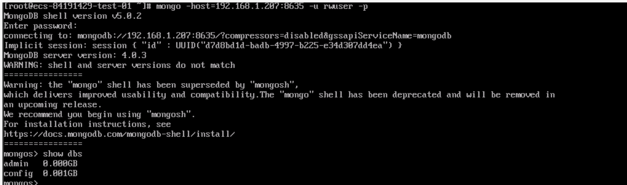 # mongo –host 192.168.1.207:8635 –u rwuser -p