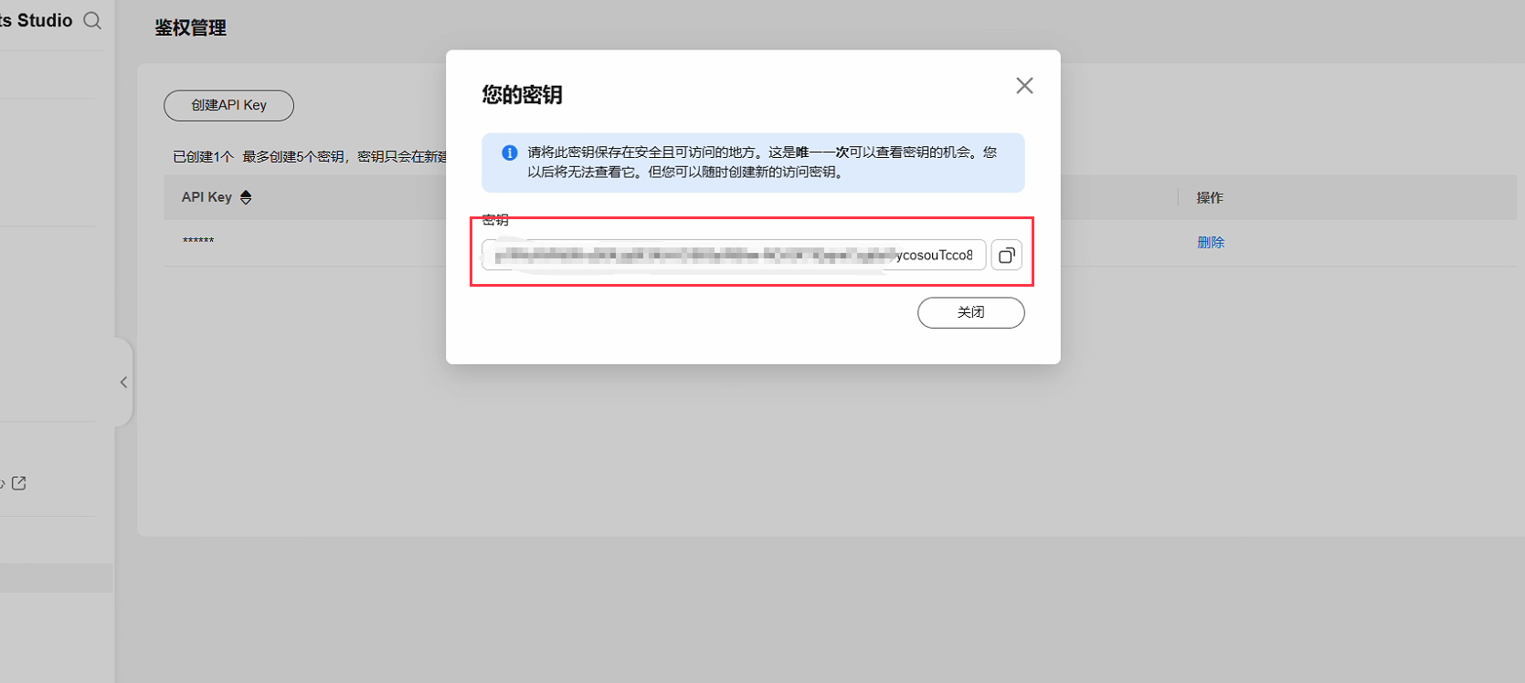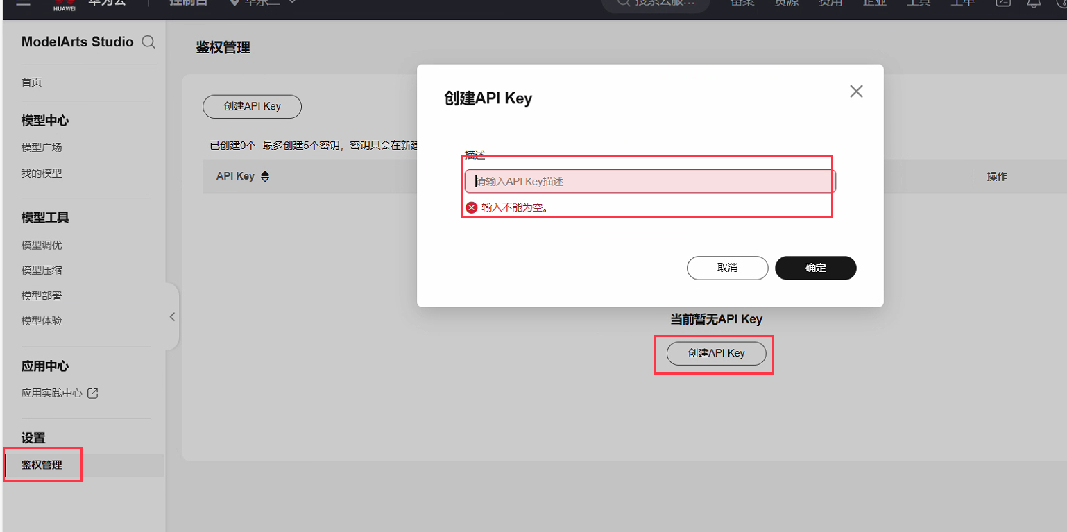 4、创建API Key,左侧鉴权管理-创建API Key