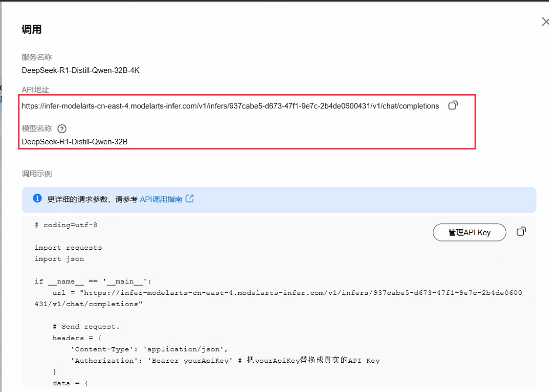 3、点击调用获取api地址和模型名称