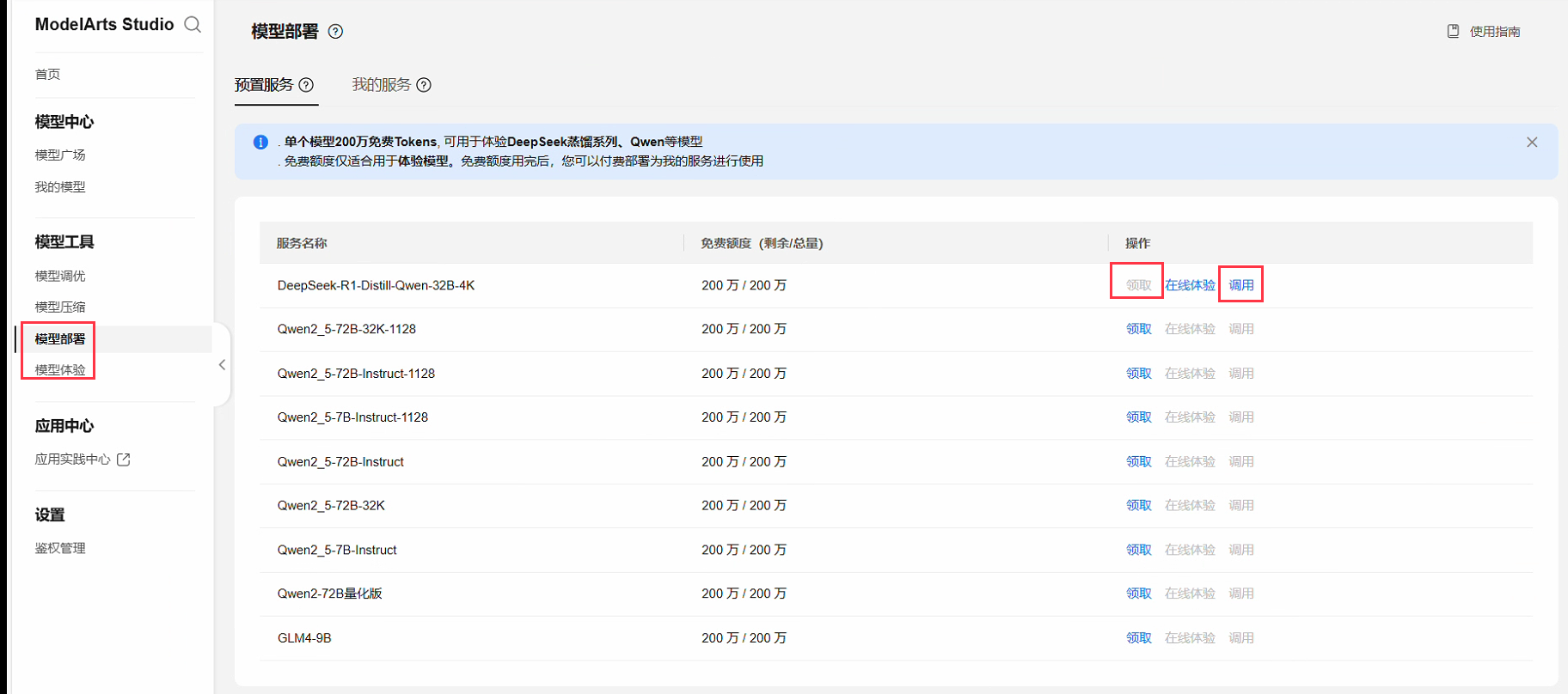 2、点击模型部署,领取对应模型,当前每个模型提供200万个tokens,测试学习基本够用了