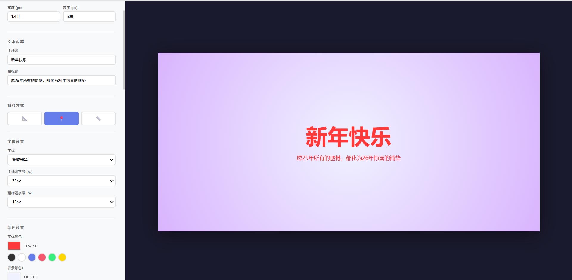 主要功能 📐 画布设置 可自定义宽度和高度(200px-2000px) 实时预览尺寸变化 ✏️ 文本编辑 主标题和副标题输入 三种对齐方式:左对齐、居中、右对齐 10种字体选择(包括中文字体) 🔤 字号控制 精确的像素值选择 主标题字号:12px - 120px 副标题字号:12px - 120px 17个标准字号可选 🎨 颜色设置 字体颜色选择器 + 6个预设颜色 主色调选择器 + 6个预设颜色 实时颜色值显示 🎭 14种视觉风格 简约白 - 干净简洁 现代紫 - 渐变紫蓝 优雅黑 - 深色高端 自然绿 - 清新自然 日落粉 - 温暖浪漫 海洋蓝 - 清新明亮 森林青 - 自然和谐 火焰橙 - 活力激情 赛博朋克 - 科技感 经典蓝 - 专业稳重 柔粉 - 温柔甜美 霓虹绿 - 酷炫发光 奢华金 - 高端大气 玫瑰红 - 优雅浪漫 界面特点 左侧设置区:所有设置选项一目了然,分类清晰 右侧预览区:实时显示设计效果 响应式设计:适配不同屏幕尺寸 美观界面:渐变背景、圆角卡片、阴影效果 所有代码都整合在一个HTML文件中,您可以直接在浏览器中打开使用。修改任何设置都会实时更新预览效果,所见即所得!