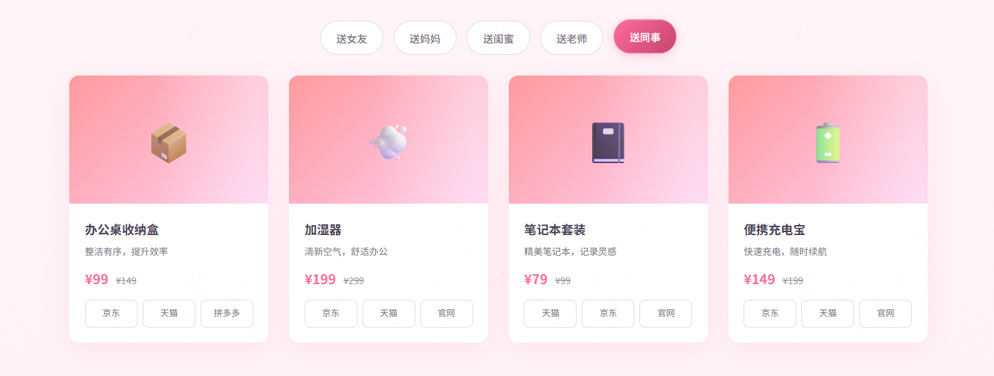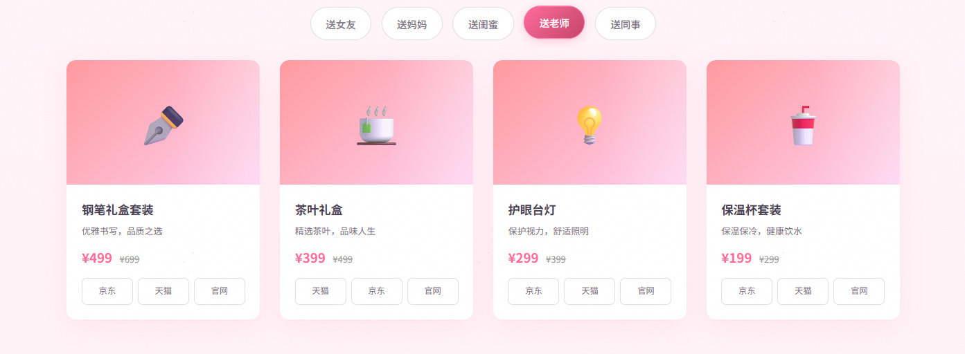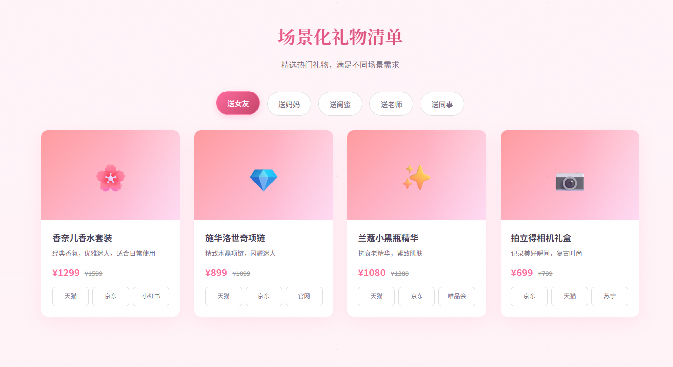 2、场景化礼物清单: 按场景分类,如“送女友”、“送妈妈”、“送闺蜜”、“送老师”等等,展示热门礼物礼物清单(使用真实数据)。