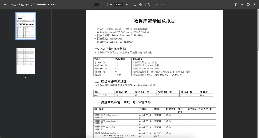 NineData 支持一键下载评估报告 + 流量回放报告,报告包含: