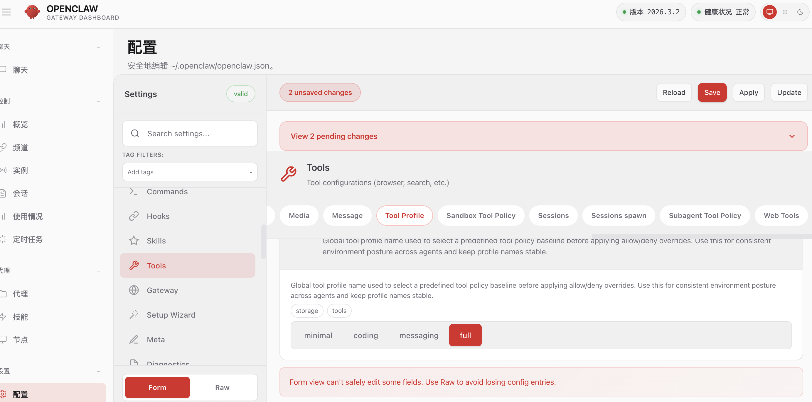 9、这时候龙虾已经可以对话了,为了增强其能力,需要修改一些配置,把tool profile改成full,这样它不仅能对话,还能处理文件。把model的context window 和max token改成128000,更大的上下文可以做更多的事情。改完save再reload就生效了。我首次安装时没有改这两个参数,导致只能对话问答,没法让它干活儿。
