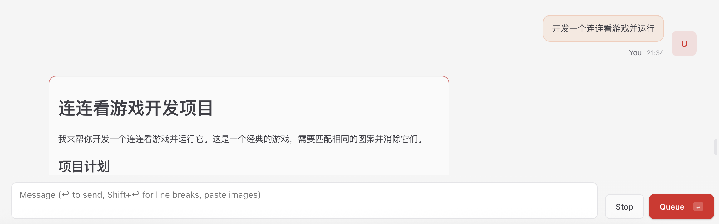 10、现在可以在对话框里输入想做的事情:“开发一个连连看游戏并运行”,它就开始干活儿了。