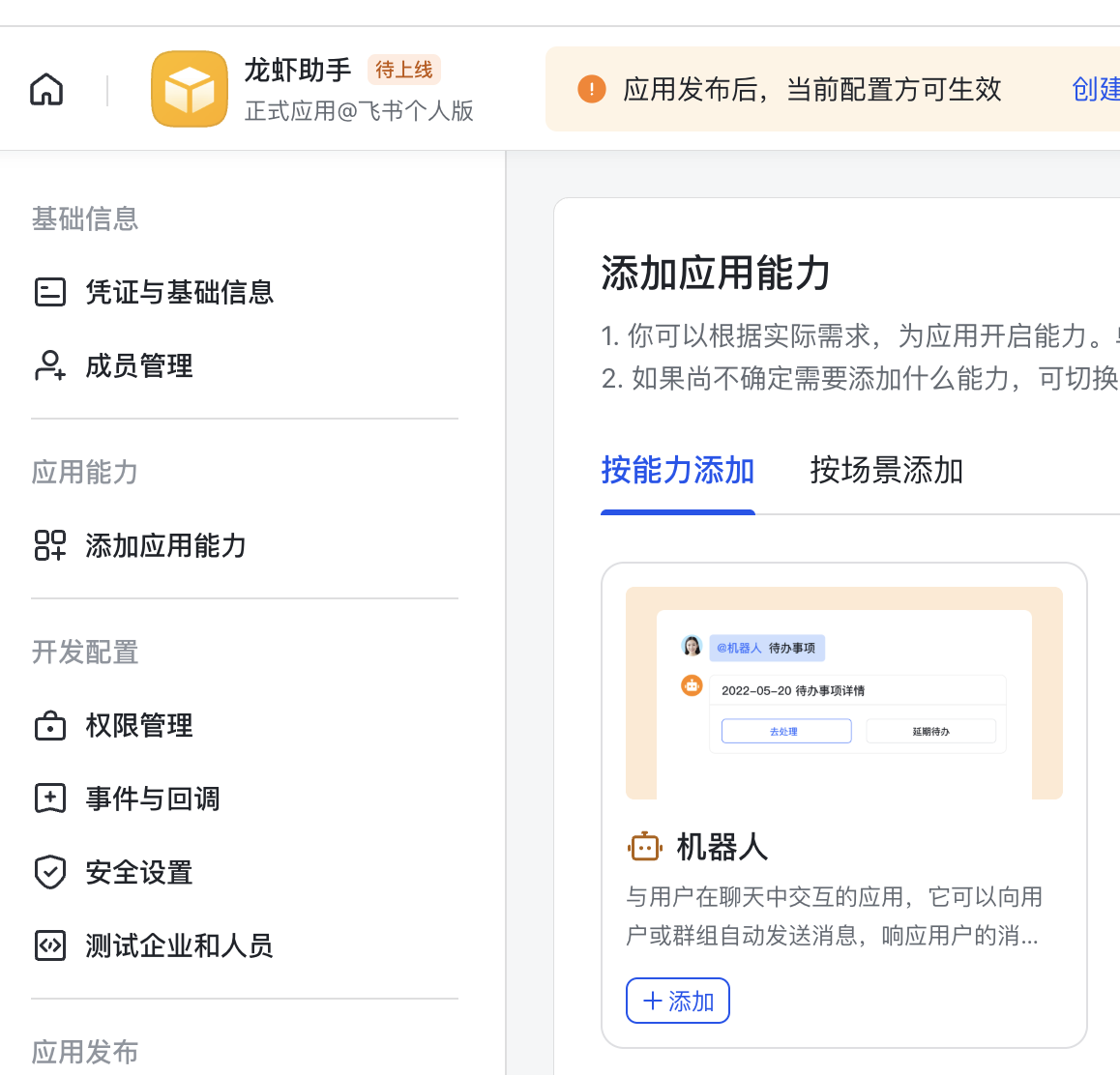 12、在这个应用添加应用能力时,选择添加机器人