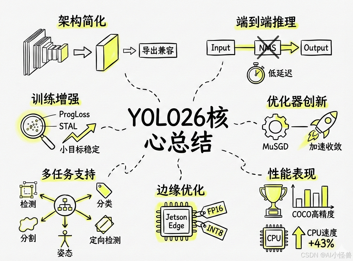 关键词:YOLO26;边缘人工智能;多任务目标检测;无NMS推理;小目标识别;YOLO(You Only Look Once);目标检测;MuSGD优化器