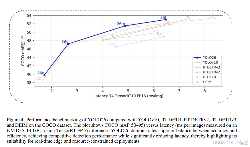 针对YOLO26,我们进行了一系列严格的基准测试,以评估其相对于YOLO前代模型和其他最先进架构的性能。图4展示了此评估的综合视图,在采用TensorRT FP16优化的NVIDIA T4 GPU上,绘制了COCO mAP(50–95)与每张图像延迟(毫秒)的关系。纳入YOLOv10、RT-DETR、RT-DETRv2、RT-DETRv3和DEIM等竞争架构,提供了近期实时检测进展的全面图景。从图中可见,YOLO26展示了一个独特的定位:它保持了与RT-DETRv3等基于Transformer模型相媲美的高精度水平,同时在推理速度方面显著优于它们。例如,YOLO26-m和YOLO26-l分别达到了高于51%和53%的竞争性mAP分数,但延迟大幅降低,这凸显了其无NMS架构和轻量化回归头带来的优势。