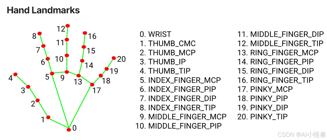 21个关键点:提供从腕部到每根手指4个关键点的详细手部姿态表征。