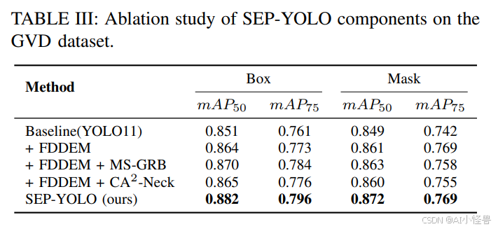 评估指标包括精确率、召回率以及边界框和分割掩码的平均精度均值。SEP-YOLO 使用 PyTorch 2.7.1 实现,输入图像尺寸为 640×640,批量大小为 4,训练 300 个轮次。采用随机梯度下降优化器,初始学习率为 0.0001,使用余弦学习率调度器和 3 个轮次的预热阶段。所有实验均在配备 NVIDIA RTX 4090 GPU 和 Intel(R) Core(TM) i9-14900KF CPU 的服务器上进行。
