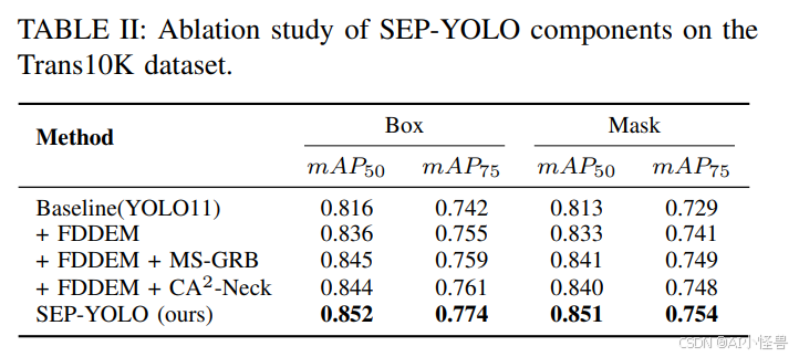 我们在两个基准数据集上将 SEP-YOLO 与八种最先进方法(包括 YOLO11)进行了比较。如表 I 所总结,SEP-YOLO 在 Trans10K 上取得了最佳性能,在 Box mAP50、Box mAP75、Mask mAP50 和 Mask mAP75 上分别超出排名第二的方法 3.6%、3.2%、3.8% 和 2.5%。在 GVD 数据集上,所有指标也观察到一致的改进。这些结果证实了 SEP-YOLO 在准确识别物体边界和生成高质量分割掩码方面的有效性。在效率方面,虽然 YOLO11 仍然是最快、最紧凑的,但 SEP-YOLO 仅增加 0.23M 参数就实现了显著更高的精度,从而在性能和复杂度之间保持了良好的平衡。