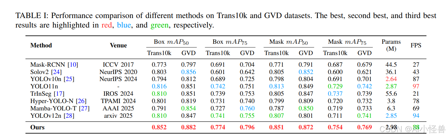 实现性能全面领先:在Trans10K和GVD数据集上,mAP50等关键指标超越SOTA方法3%以上,同时保持轻量级架构与实时推理速度。