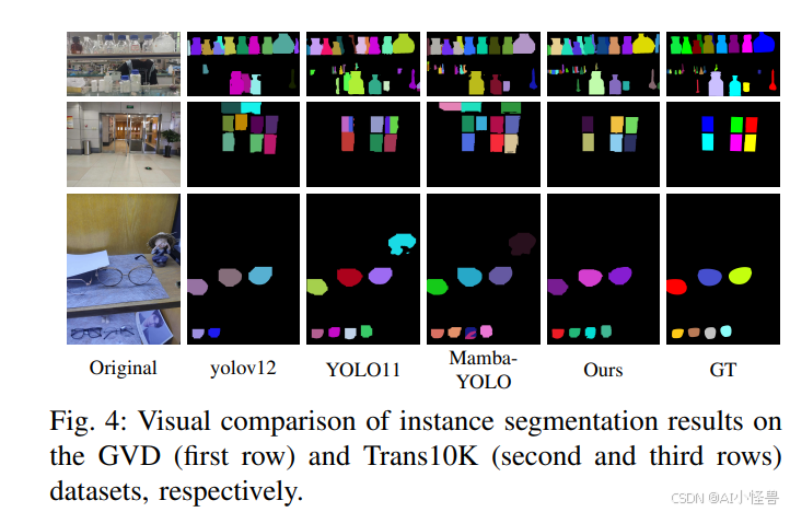 我们为Trans10K数据集[18]提供了高质量的实例级标注,填补了日常场景下实例分割的数据空白。我们的方法在Trans10K和GVD数据集上均实现了最先进性能,同时保持了实时推理速度,展现了在工业应用中的强大潜力。