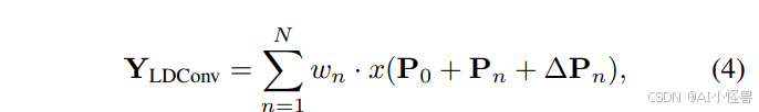 其中N是卷积参数的数量,P_n是由算法生成的初始采样坐标,∆P_n是学习到的偏移量。该公式使LDConv能够在下采样期间捕获广泛的全局上下文,同时保留空间细节,其参数量随核大小线性增长,而非像标准和可变形卷积那样呈二次增长。