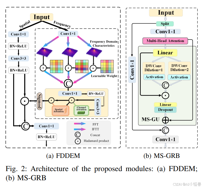 其核心组件是多尺度门控单元,本质上是卷积门控线性单元[20]的多尺度变体。它采用多尺度深度可分离卷积聚合多尺度深度卷积以实现高效的上下文提取,同时确保计算效率。作为一个多尺度CGLU,它增强了空间提取特征的非线性表示能力,并优化了跨尺度特征细化;门控机制[21]进一步对这些细化后的特征执行自适应通道加权和噪声抑制。完整的MS-GRB操作将MS-GU与残差学习相结合: