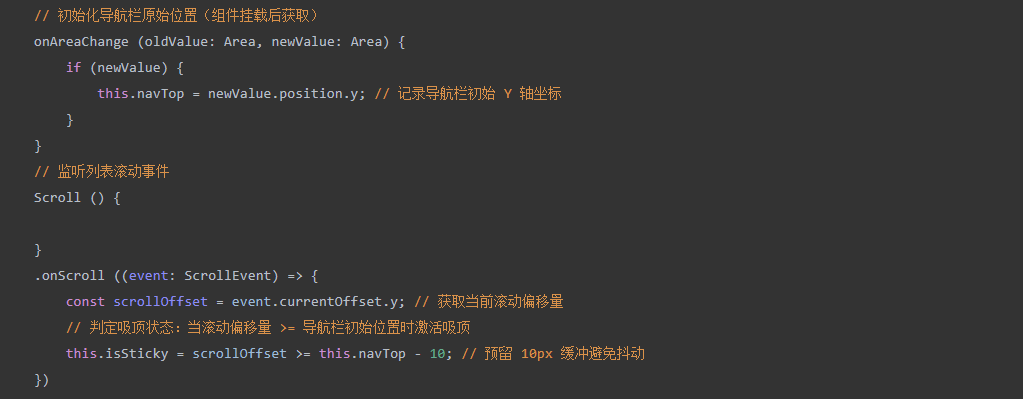 通过 Scroll 组件的滚动事件回调,实时获取滚动偏移量,结合导航栏原始位置坐 标,建立状态判定机制(未滚动、滚动中、已吸顶),确保状态切换及时准确。