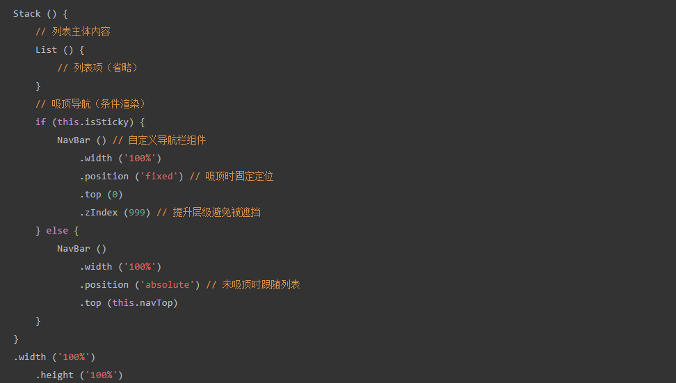 采用 Stack 层叠布局分离列表内容与导航栏,通过条件渲染控制导航栏 “absolute 定位” 与 “fixed 定位” 的切换,避免层级冲突;同时设置 zIndex 属性保障导航栏 显示优先级。