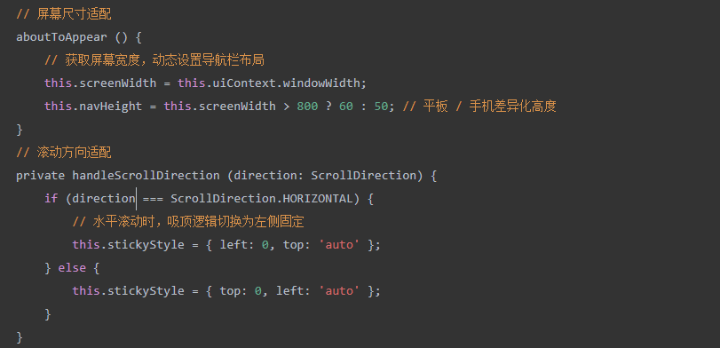 获取设备屏幕尺寸、列表布局参数,动态计算导航栏宽高、吸顶阈值;针对不同滚 动方向,调整监听维度与定位逻辑,实现多场景兼容。