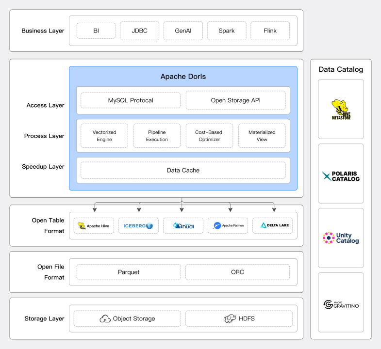 - Doris 定义了标准三层元数据模型:数据目录(Catalog)、数据库(Database)、数据表(Table)。无论是 Hive、Iceberg、Hudi、Paimon,还是支持 JDBC 协议的数据库系统,Doris 均能轻松连接并高效提取数据。