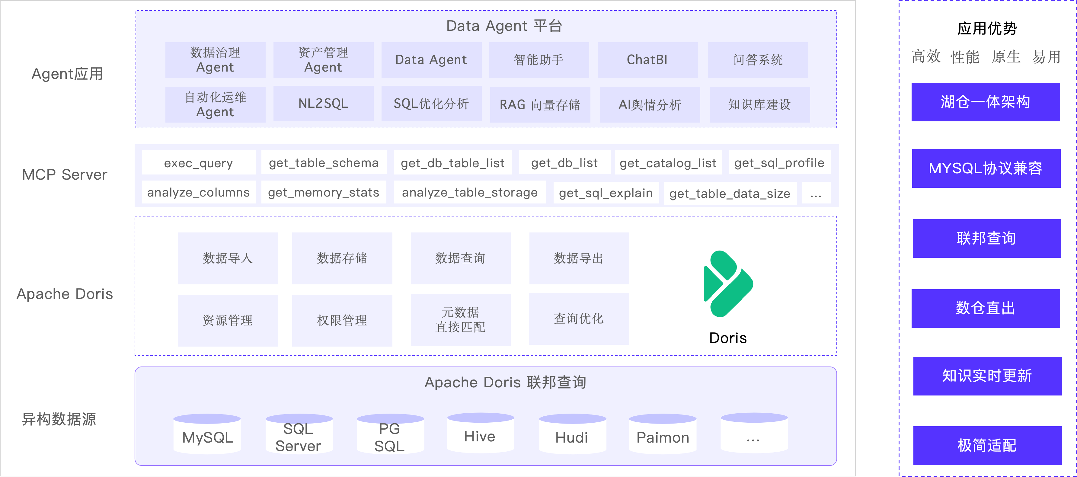 Apache Doris 天然支持多源联邦查询,可无缝对接 MySQL、Hive、PostgreSQL、Hudi 等异构数据源。这意味着,上层 AI 应用无需关心数据实际存储在何处,只需通过 Doris 即可统一访问数仓内的离线历史数据、实时增量数据以及业务库中的维度信息。这种能力为 AI 模型训练、特征工程、实时推理等场景提供了高效、统一的数据供给通道。