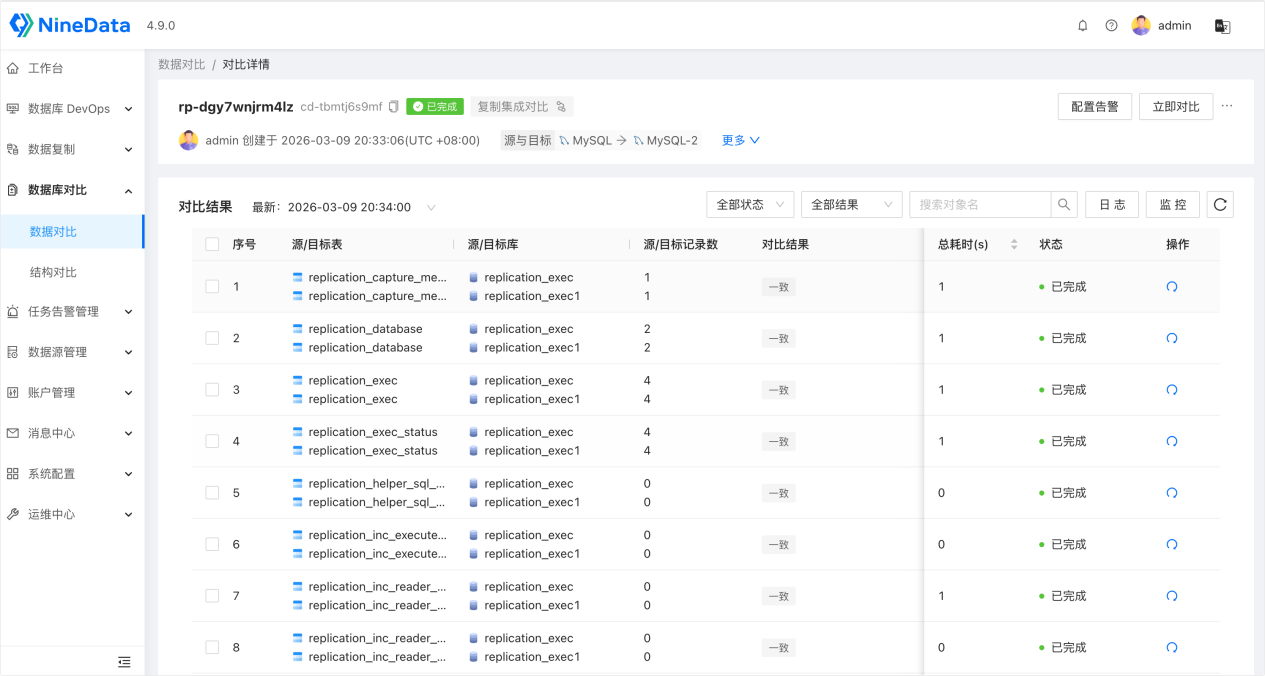 NineData 数据对比功能,是面向数据迁移、数据同步、容灾校验场景的标准化一致性校验能力,从结构对比、全量数据对比、差异自动修复三个维度,提供可量化、可追溯、可落地的一致性保障。
