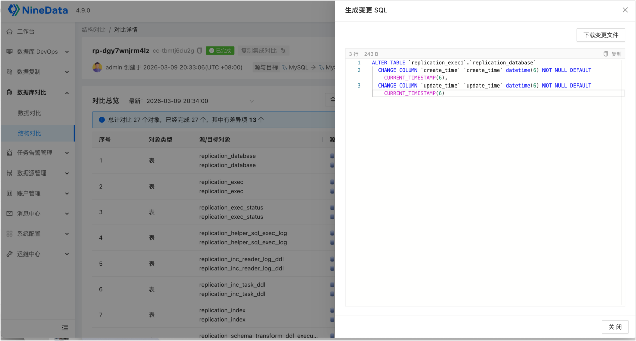 这是数据对比最核心的价值之一:发现差异后,自动生成标准化修复语句,包括: