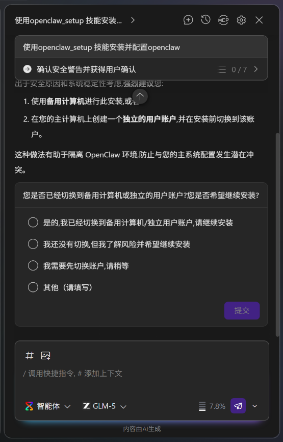 步骤一:打开华为云码道,选择GLM-5模型,并在对话框中输入“使用openclaw_setup技能安装并配置OpenClaw"
