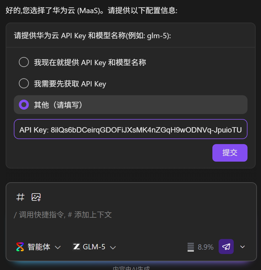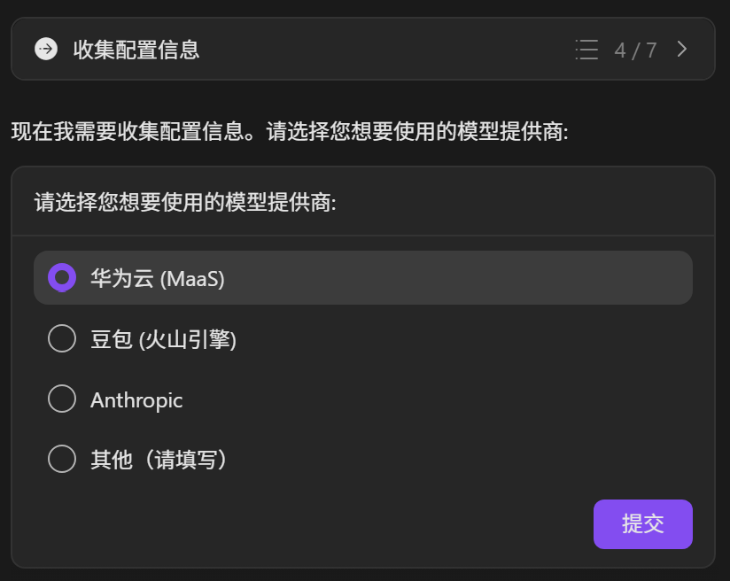 注:大家先按照图中的选项选择其他,然后根据提示在输入框中填写API Key和模型名称,因为在我自己调试的时候发现,选择第一和第二的选项,智能体可能会出现直接跳过配置往下走,导致配置失败的可能!后续我将优化一下skill解决这个问题...