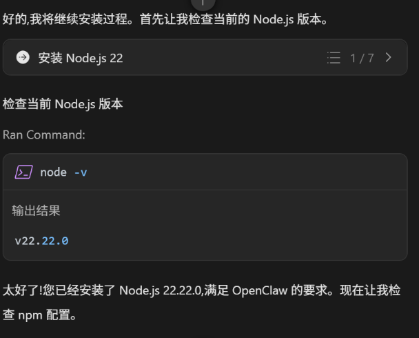 步骤三:智能体自动完成Node.js、OpenClaw的安装,这里特别提一下,很多小伙伴可能会遇到下载速度慢的问题,这里推荐大家使用CodeArts镜像站(这部分我已经写在skill里,供大家参考)
