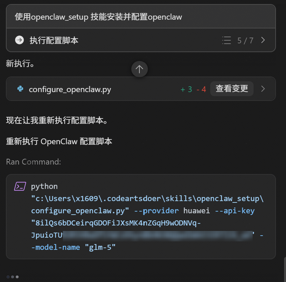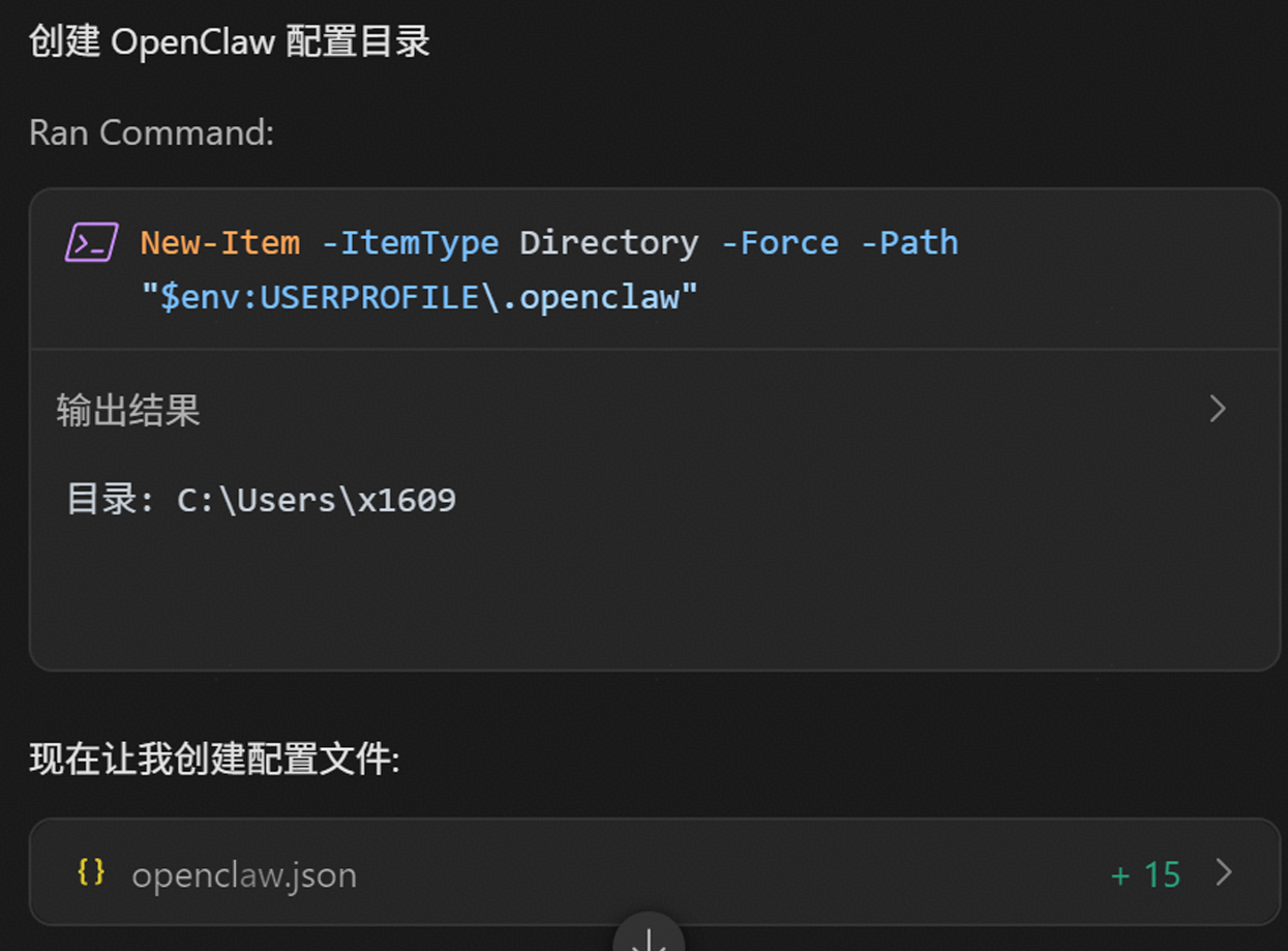 随后Agent会创建OpenClaw的配置文件,此处可能执行Python配置脚本,也可能直接写配置文件。(Windows场景优选直接写配置文件)