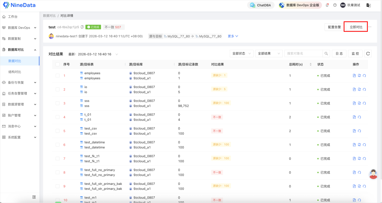 修复完成后,可在 NineData 中重新启动对比任务,或在原有任务中点击「立即对比」,验证修复后的源、目标数据是否一致。对比结果会实时更新,清晰展示所有表 / 结构的一致性状态,确保无遗漏差异。