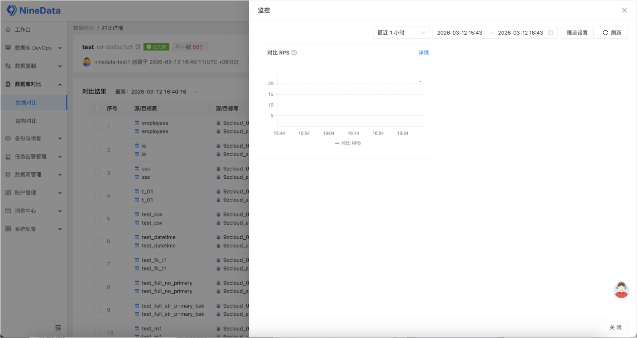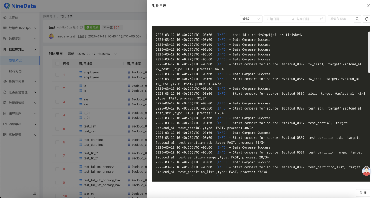 NineData 支持查看对比任务的完整日志和监控指标,包括任务执行时间、对比进度、差异详情、修复记录等,所有操作可追溯、可审计,不仅能排查问题,还能满足企业内部管理与操作追溯需求。
