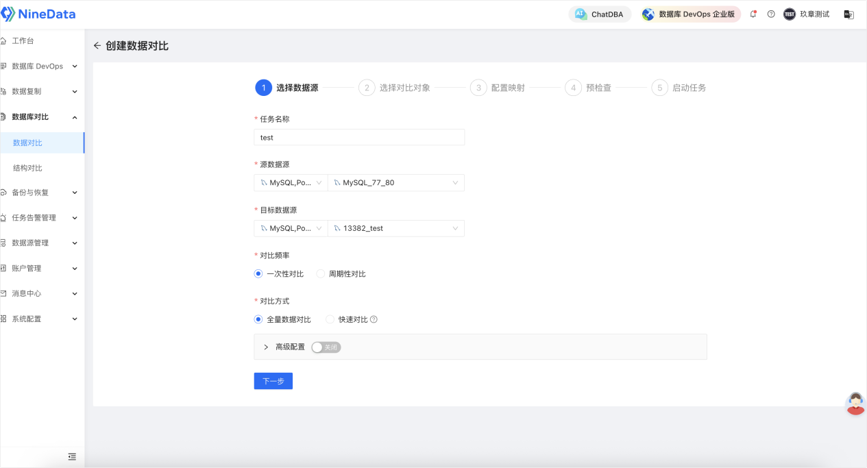 进入 NineData 工作台,选择「数据库对比」> 「数据对比」>「创建数据对比」,依次填写任务名称,选择源、目标 MySQL 数据源,配置对比频率(一次性对比 / 周期性对比)、对比方式(全量数据对比 / 快速对比),确认映射关系后完成预检查,即可进入下一步,整个配置过程最快仅需 60 秒即可完成。