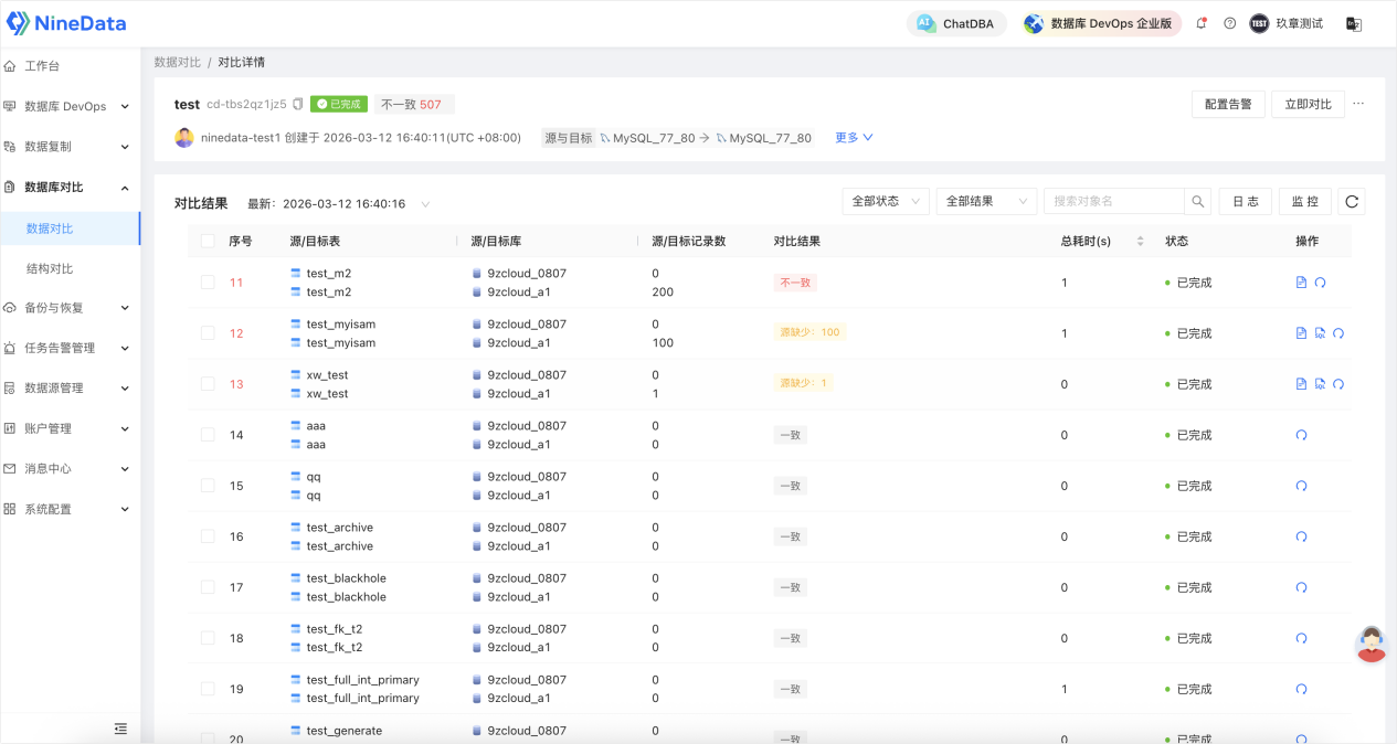 任务启动后,NineData 会自动执行对比,任务完成后,在对比详情页面可清晰看到任务状态、源 / 目标数据源信息,以及每张表的对比结果 —— 包括源记录数、目标记录数、是否一致、差异数量,结构对比还能精准定位到具体不一致的对象类型(表、索引、约束等)。