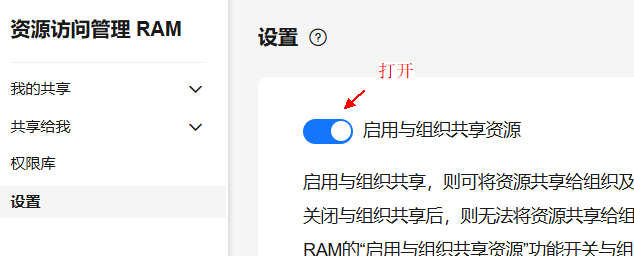 由于后续我们需要创建组织,所以要开通组织服务,而开通组织服务要先开通企业中心,当我们后面共享资源的时候需要接收方进行接收,我们打开自动接收就不用再去控制台上进行操作了。