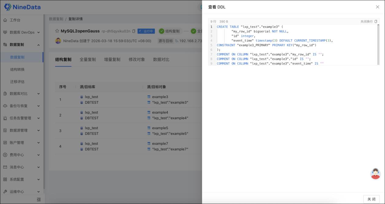 NineData 会先对源端结构进行解析,并在进行自动的数据类型映射,完成全部结构的迁移。