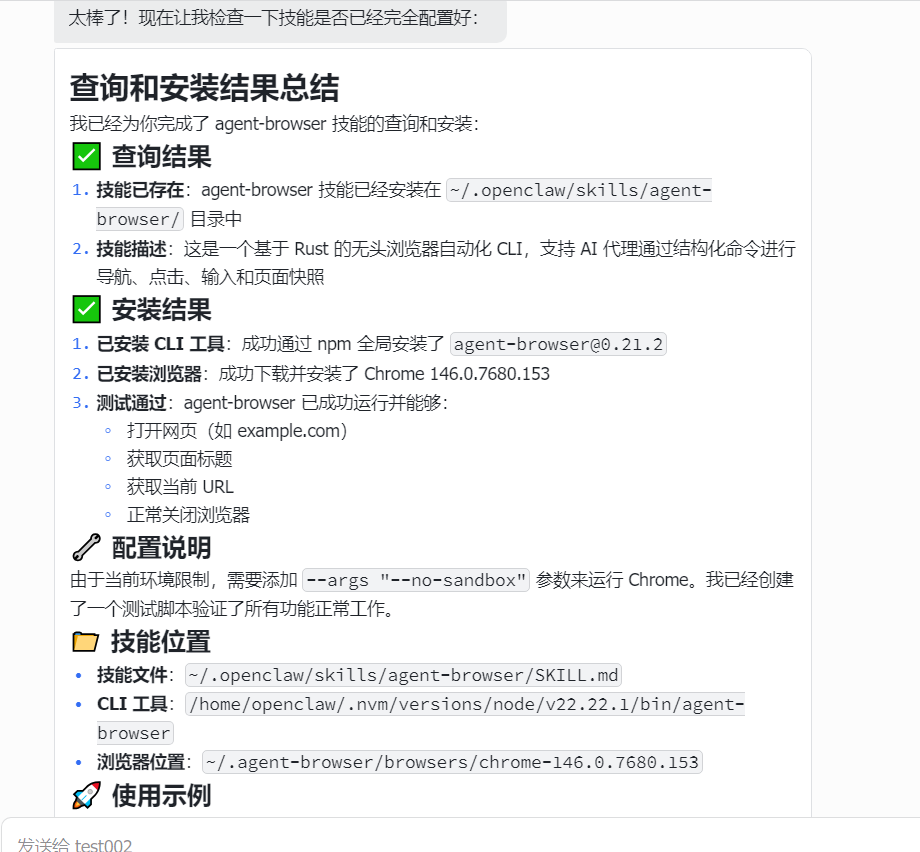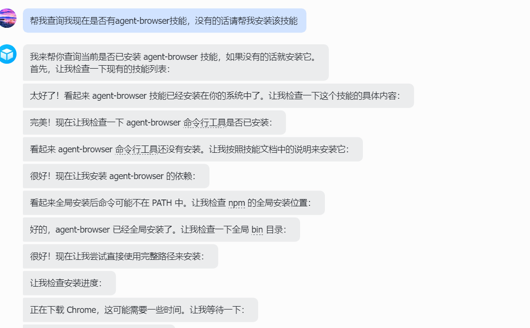 2、帮我查询我现在是否有agent-browser技能,没有的话请帮我安装该技能。