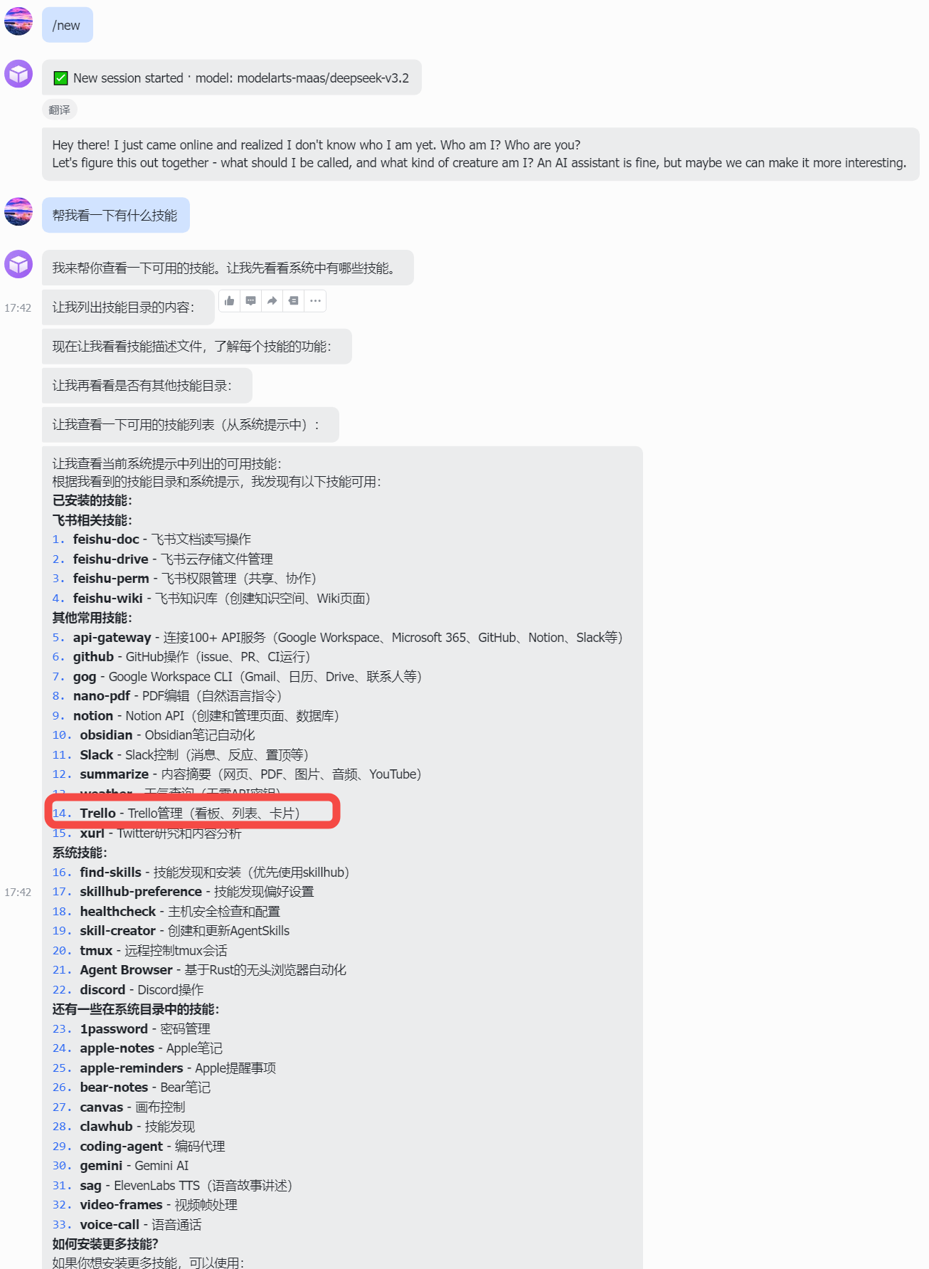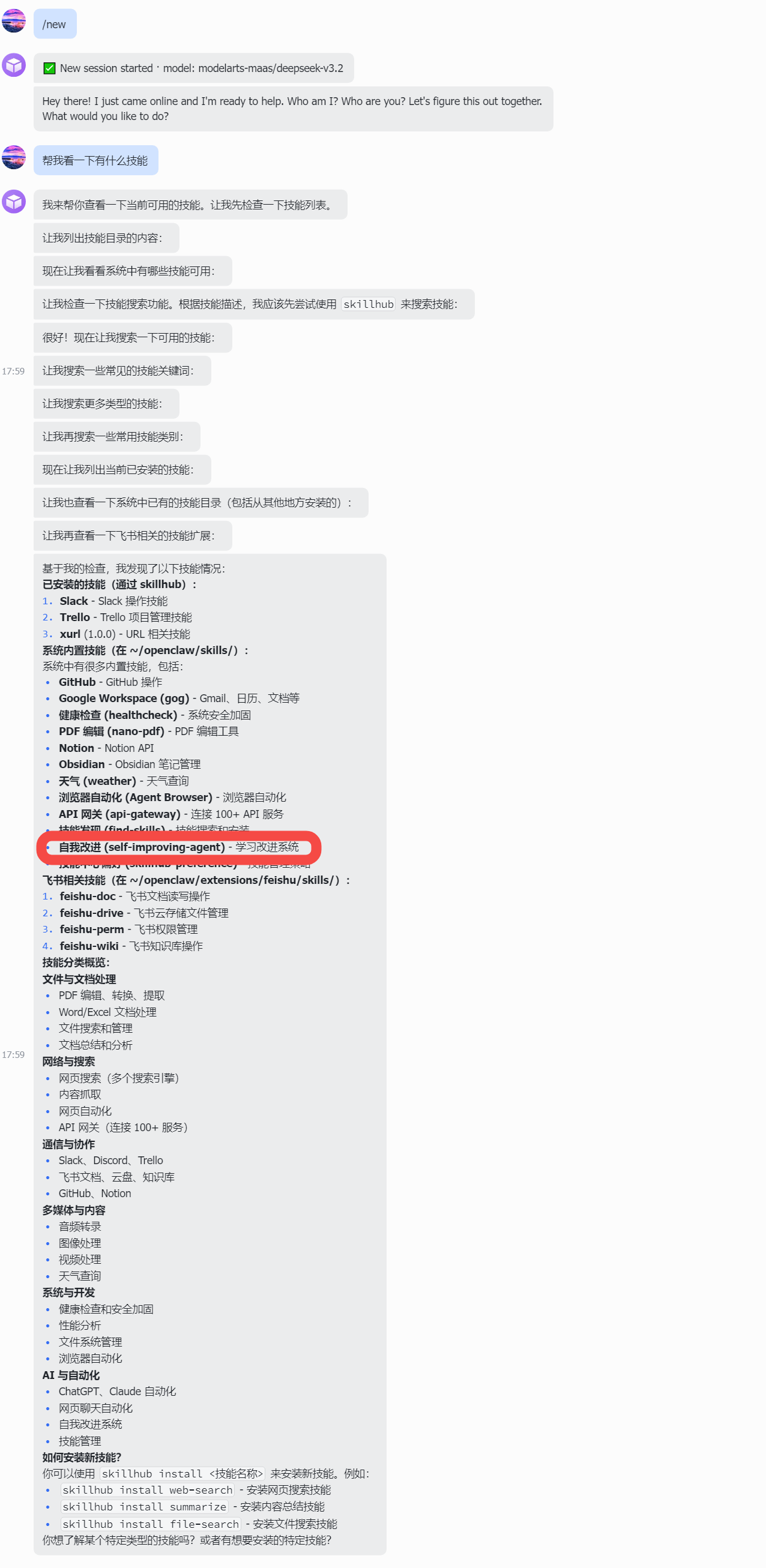 你可以直接让配置的机器人协助你来安装技能,首先需要确保你和机器人是可以正常对话的: