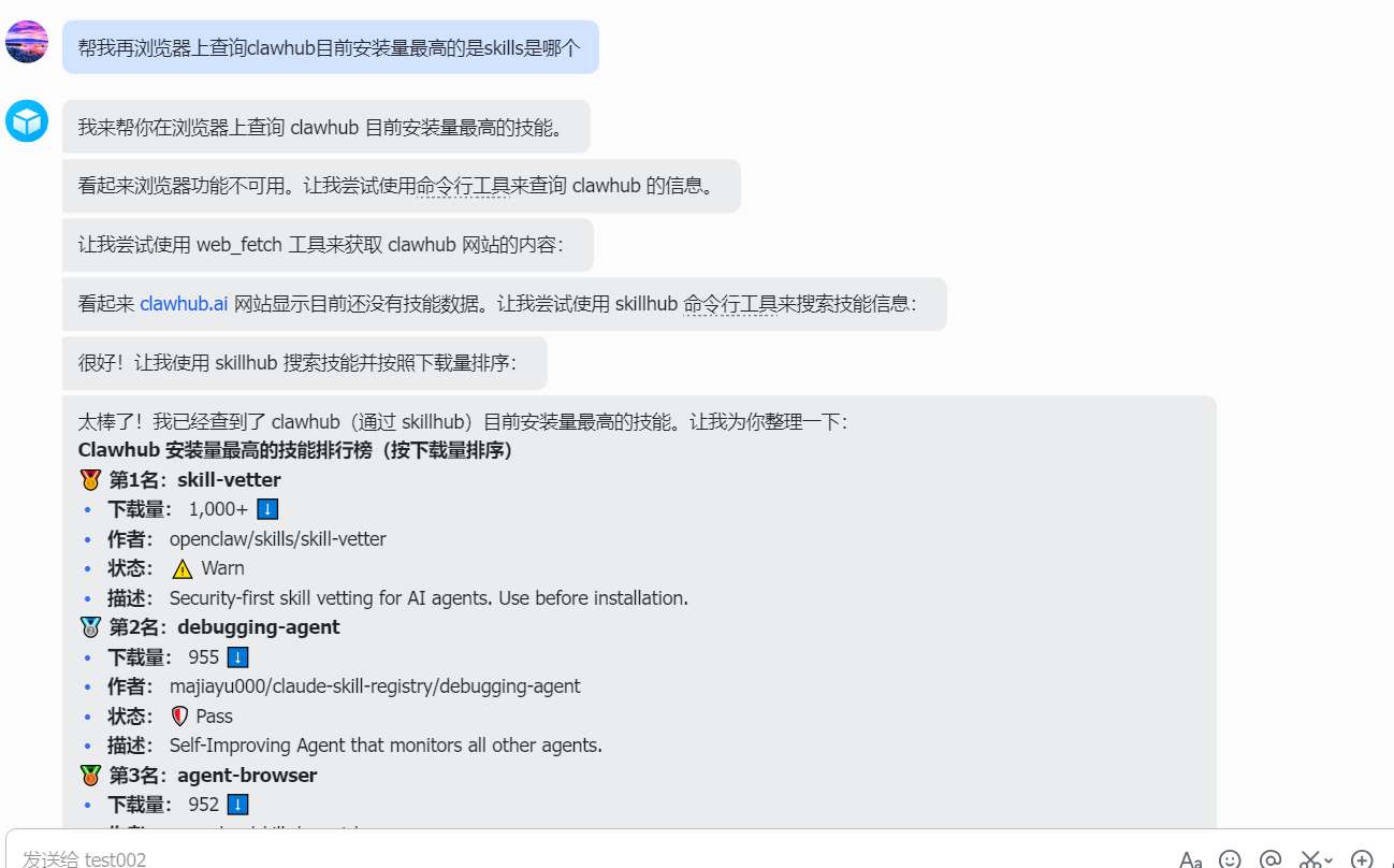1、帮我在浏览器上查询clawhub目前安装量最高的是Skills是哪个?