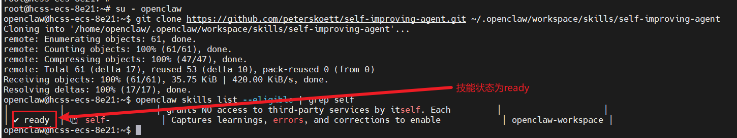 openclaw@hcss-ecs-d448:~$ git clone https://github.com/peterskoett/self-improving-agent.git ~/.openclaw/workspace/skills/self-improving-agent