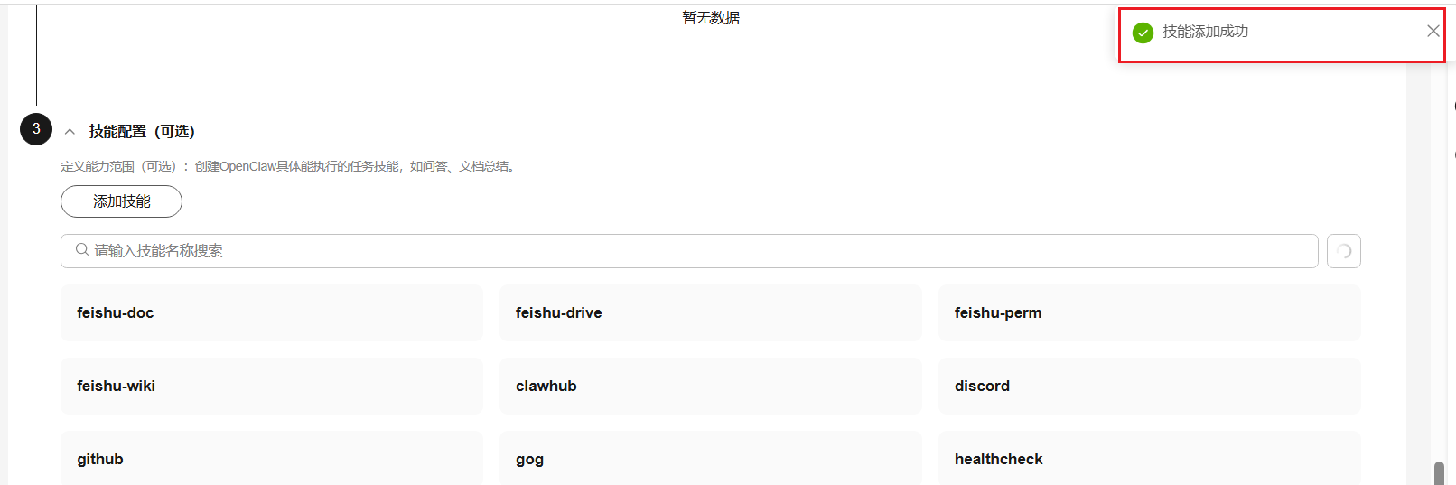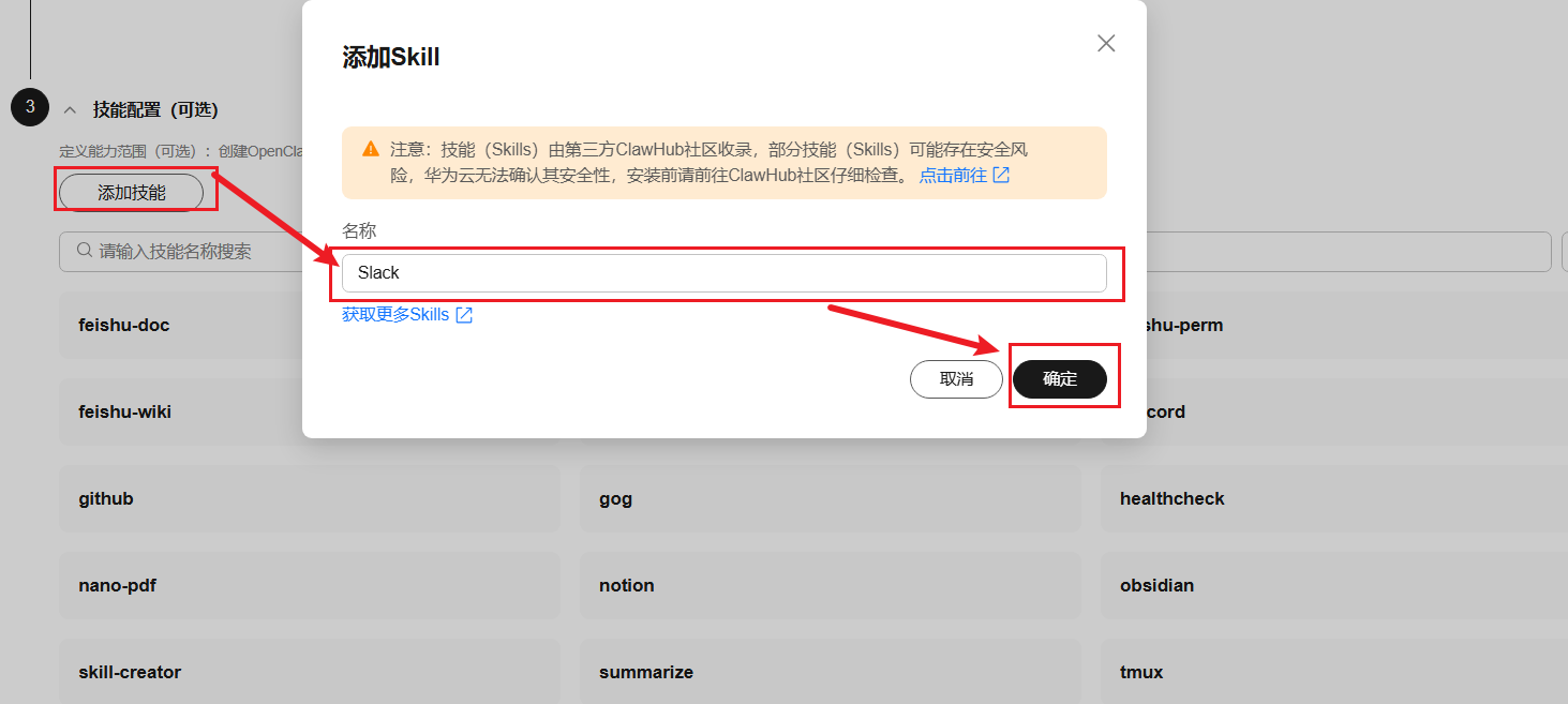 2、下拉选择3-技能配置,单击添加技能,输入需要安装的技能名称(可单击“获取更多Skills”,跳转页面搜索需要安装的技能名称),单击确认;