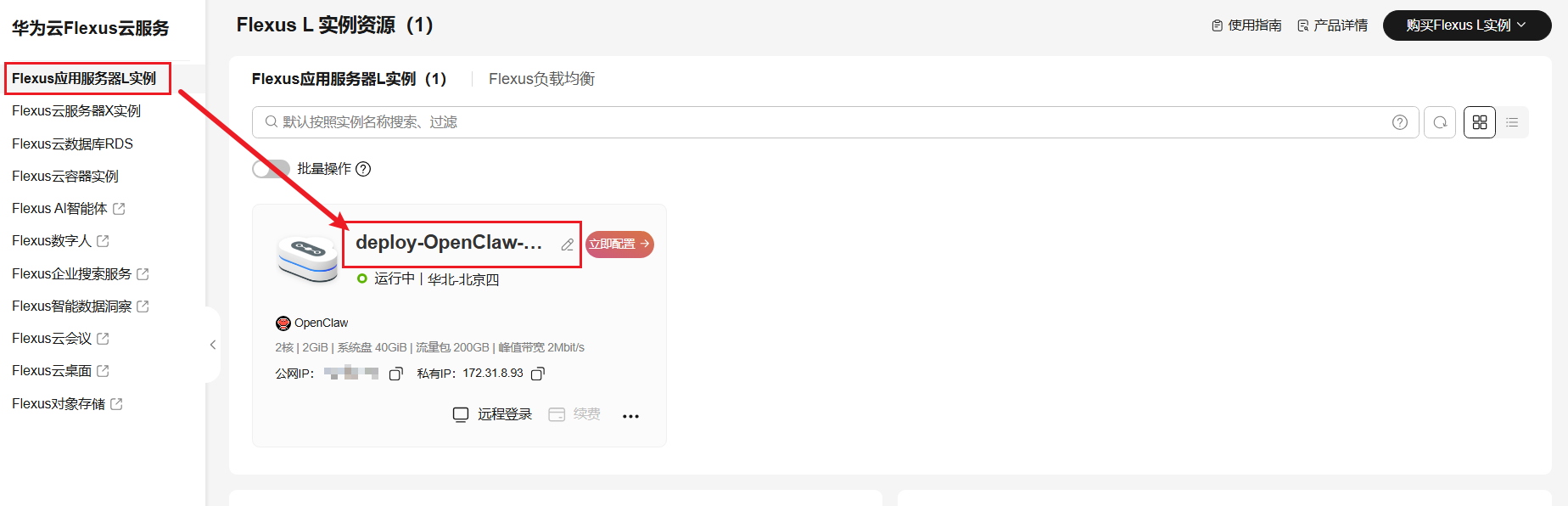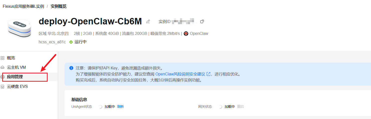 1、登录华为云Flexus云服务 - 控制台,单击已购买的L实例名称/ID,进入实例概览,单击应用管理;