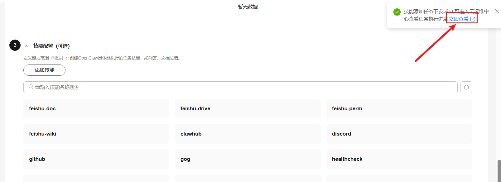 3、右上角提示“技能添加任务下发成功”,可单击下发任务处链接查看技能安装进度,已安装技能处查看技能是否安装成功;