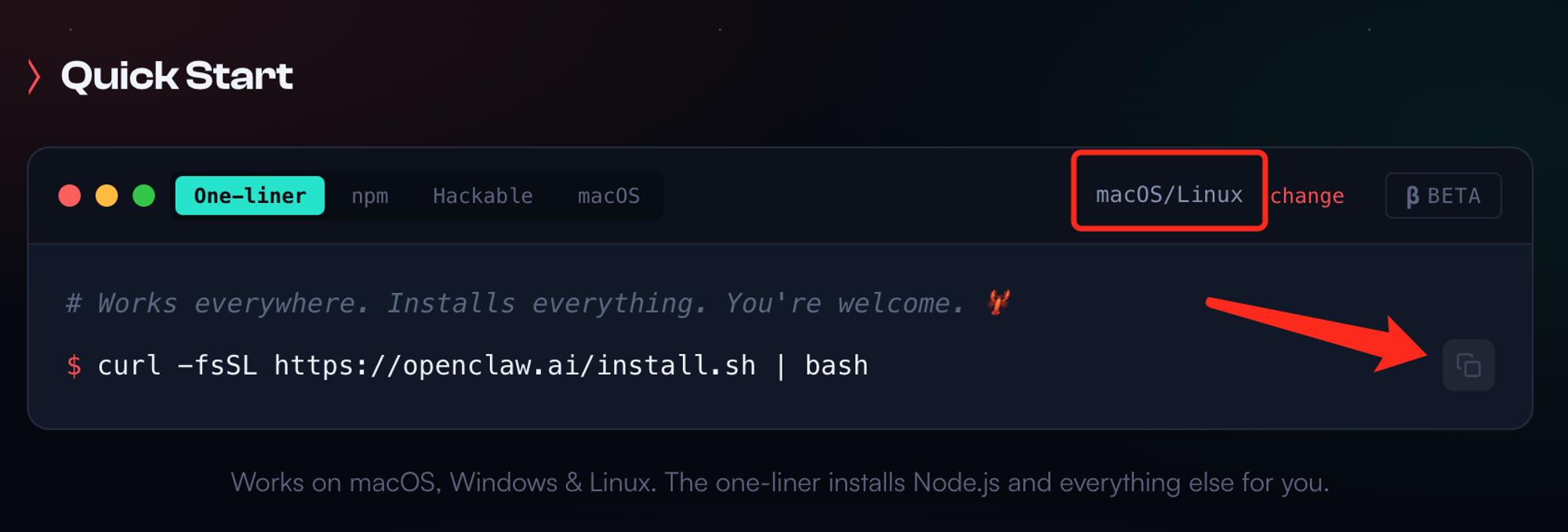 打开 Openclaw 官网:http://openclaw.ai/ ,下滑找到下图位置