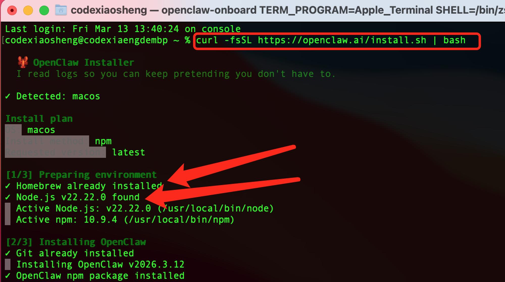 这里看到 Homebrew 和 Node.js 都已经安装成功,且能显示出版本号,这两是必须的前提条件。