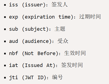 Payload 部分也是一个 JSON 对象,用来存放实际需要传递的数据。JWT 规定了7个官方字段,供选用。