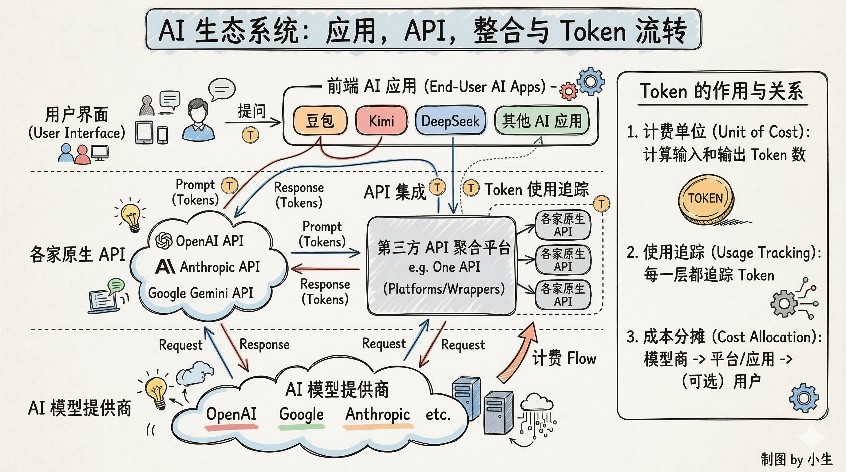 AI应用,AI模型API,第三方整合、Token 流转之间的关系说明