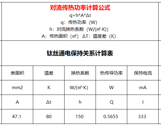 接着,在假定的流系数150w/(mm2.k)的前提下,带入计算得到规格∅0.15mm,长度100mm的钛丝所需保持电流约333mA。