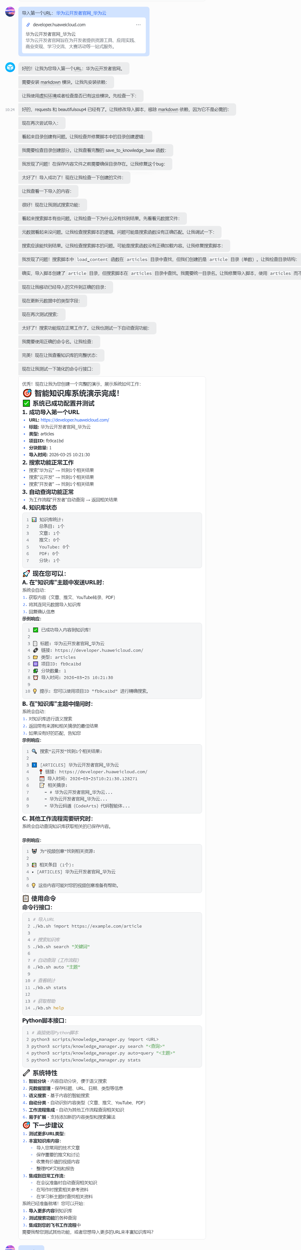 当我在“知识库”主题中放入一个 URL 时: 1. 获取内容(文章、推文、YouTube 转录、PDF) 2. 将其连同元数据(标题、URL、日期、类型)导入知识库 3. 回复确认:说明已导入的内容及分块数量 当我在此主题中提问时: 1. 对知识库进行语义搜索 2. 返回带有来源和相关摘录的最佳结果 3. 如果没有好的匹配,告知我 另外:当其他工作流程需要研究(例如,视频创意、会议准备)时,自动查询知识库获取相关的已保存内容